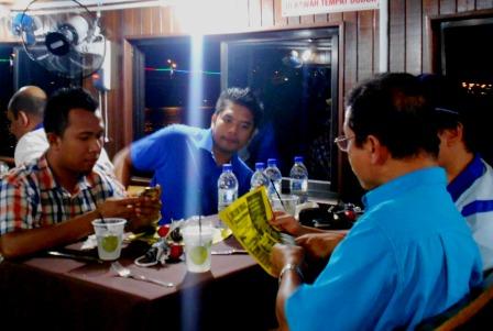 Rasa seronok apabila sekali sekala bersama dan bertukar pandangan terutama dalam hal ehwal industri pelancongan di negeri Terengganu. Apa yang istimewa adalah masa bersama ini diraikan dalam majlis makan malam istimewa di atas bot penambang yang kini telah dinaik taraf sebagai bot pelancong untuk menyusuri Sungai Terengganu.